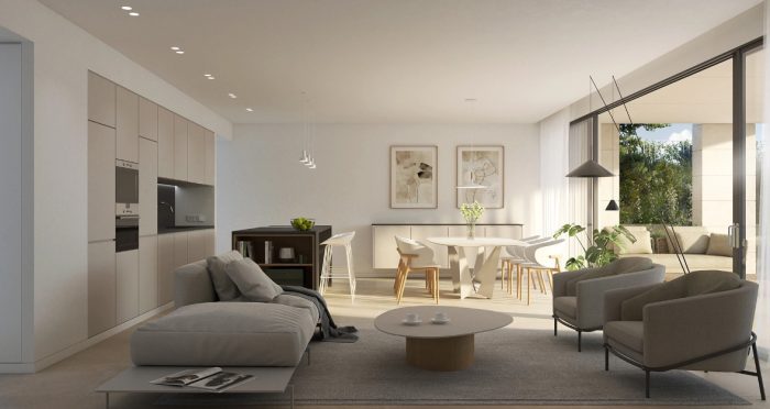 O design de conceito aberto integra a sala de estar, a sala de jantar e a cozinha num espaço de até 12 metros quadrados, conectando-se perfeitamente ao terraço exterior, proporcionando abundante luz natural e ventilação a cada unidade.